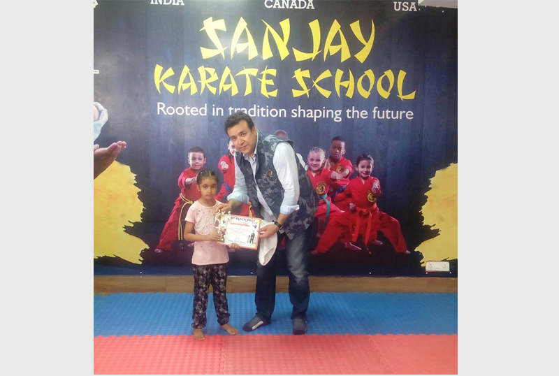 Rishab Goel, a 13 year karate student of sanjay karate school proved his excellence when a bully got entered forcefully in to his house in the morning at around 11am. Rishab was all alone at that time. As he entered in to his house he wrapped rishab’s neck by a rope and tried to compress it. He couldn’t be successful in his t85/ask when rishab , the martial arts student , an 8th standard student of DPS school kicked below his stomach in order to defend himself. In the mean time , the bully started wriggling and left Rishab and his house. On behalf of his speechless bravery , he has got promoted to the seniors batch i.e., BBM stands for BLACK BELT MEMBERSHIP by our well known and one of the most respected dignitary of India Mr. Sanjay Gokal, the Managing Director of Sanjay Karate School. He is now learning his training with seniors.